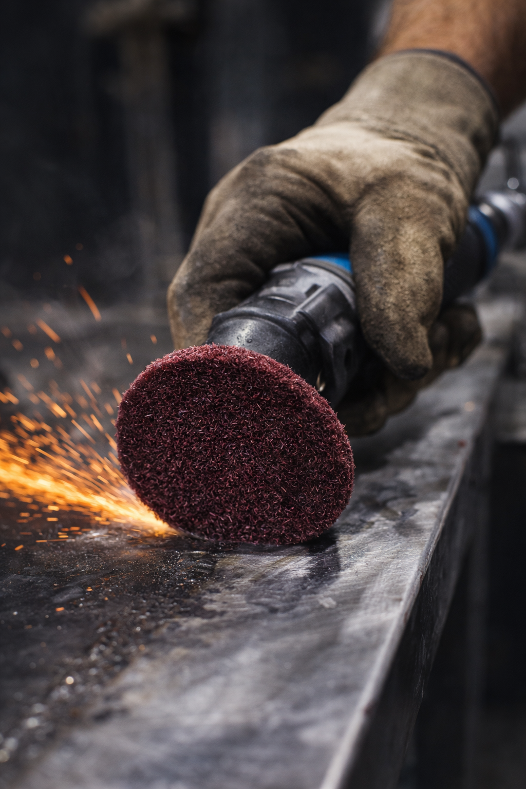 • Tough non-woven disc aggressively deburrs and finishes