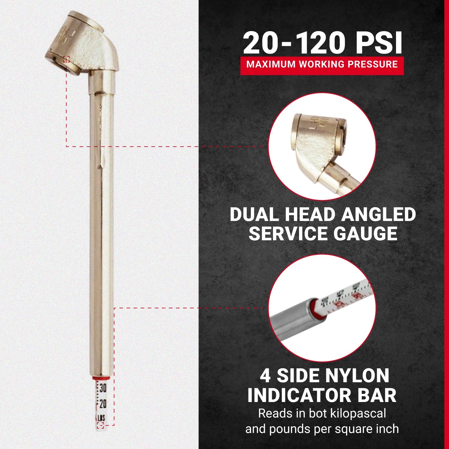 • Tire gauges provide accurate, long life with trouble free performance